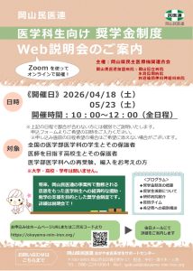 岡山県民主医療機関連合会では、医学科生向けの奨学金制度WEB説明会を毎月行っています。